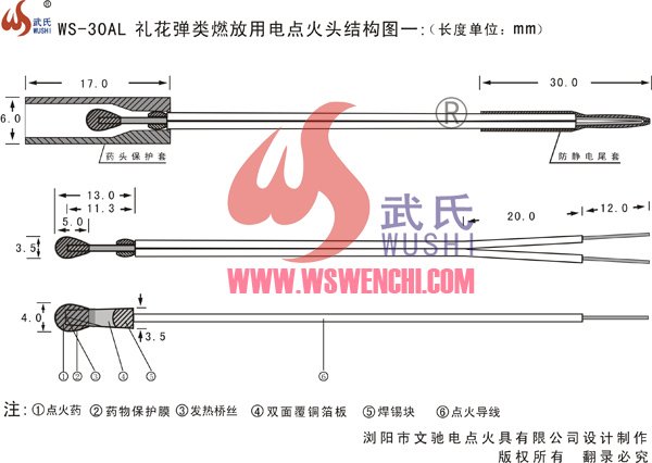 概述:该电点火头是国内、国际市场上出现得最多、最普遍的产品,其固定绝缘片采用的是镀锡双面覆铜板,为了改进点火感度可对点火头桥丝做此变动:任意一种点火头药剂都能用任意一种点火桥丝,药头采用单层点火药物,药头大小均匀,性能一致。我公司生产的该型号电点火头,具有国际一流的品质,在所规定的参数范围内,绝对保证串联组点火正常,无瞎火现象,每批次质量稳定,并能确保在毫秒级内同时点火。